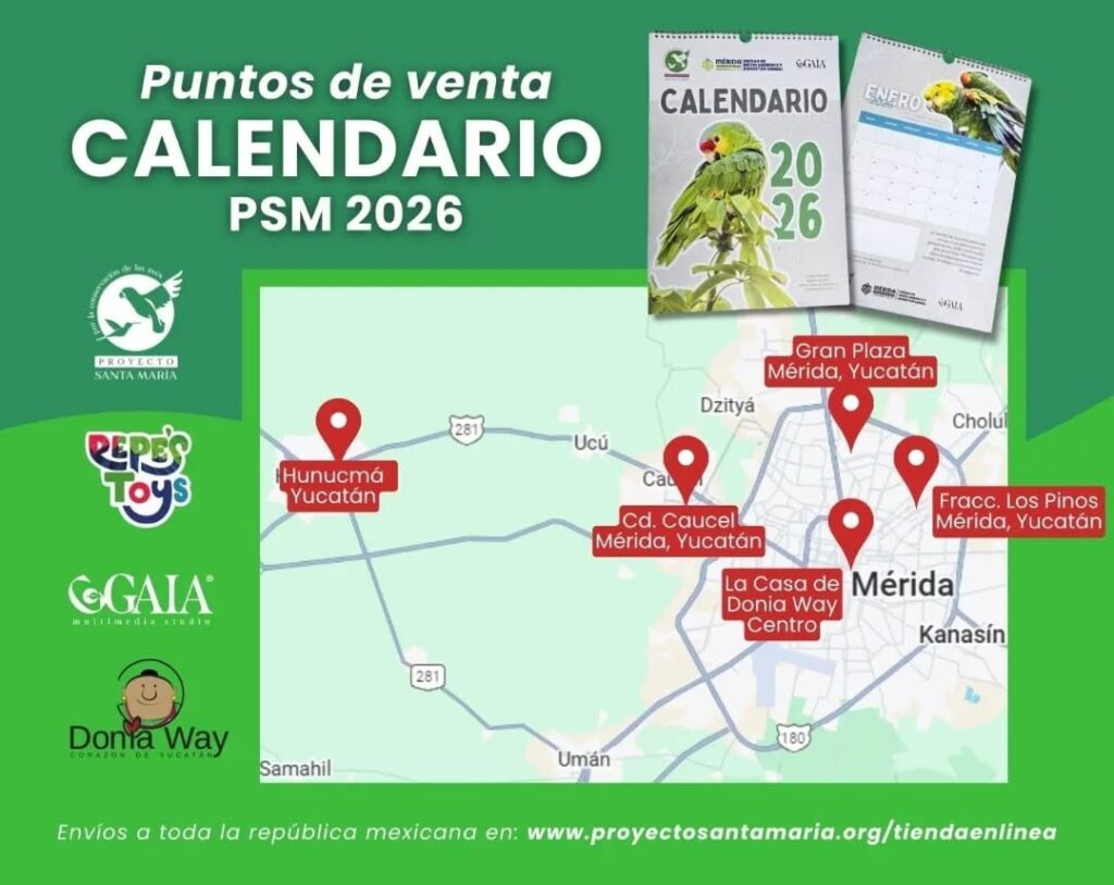 MÉRIDA, Yucatán, 08 de enero 2026 (entresemana.mx). La tienda de artesanías «La Casa de Donia Way» y la tienda de artículos para mascotas «Pepe´s Toys», destacados promotores de la conservación de loros yucatecos ya tienen a la venta el Calendario de Loros 2026 del Centro de Difusión y Conservación Ambiental Proyecto Santa María.