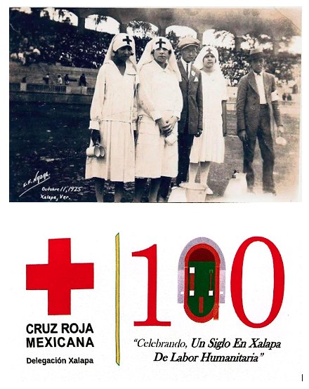 La imagen data del once de octubre de 1925, en el recién inaugurado Estadio Jalapeño, durante un acto presidido por el presidente de la República, General Plutarco Elías Calles, y el gobernador Heriberto Jara Corona. Es probable que el evento constituyera la primera colecta para la recién fundada Delegación de la Cruz Roja de Xalapa. En la escena aparecen cuatro jóvenes voluntarios de la institución; tres son jóvenes mujeres, una de ellas sosteniendo un tazón para la colecta, y dos jóvenes hombres vestidos de manera normal.