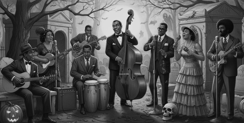 En la era del swing, Cab Calloway se convirtió en un ícono del jazz funerario con «St. James Infirmary Blues», inmortalizado en un corto de Betty Boop donde se transforma en un ánima, mientras «Minnie the Moocher» es un viaje onírico al otro mundo. La teatralidad pasó al rock and roll con el beat de Bo Diddley, ¿en temas como “Who Do You Love?», dándole un ambiente sepulturero.