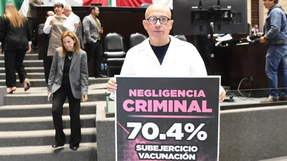El panista, médico cirujano con doctorado en Ciencias de la Salud por la Universidad Pacific Western, California, subió a la tribuna con legisladores de su bancada quienes llevaban varias pancartas con la leyenda: “Negligencia criminal. 70.4% de subejercicio en vacunación”.