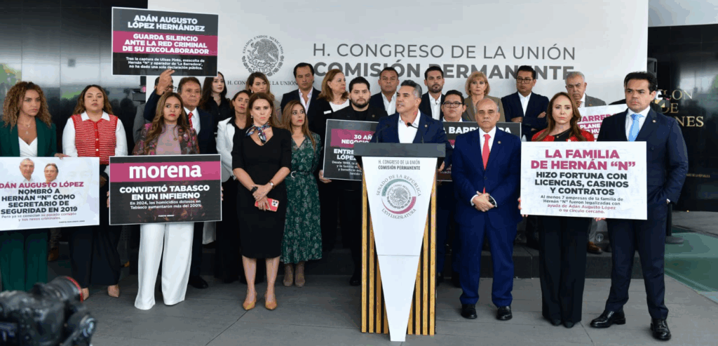 Informó que el PRI presentó denuncias penales ante la Fiscalía General de la República (FGR) contra gobernadores, exgobernadores, funcionarios, legisladores, el expresidente Andrés Manuel López Obrador y el senador Adán Augusto López Hernández, todos por presuntos nexos con el crimen organizado.