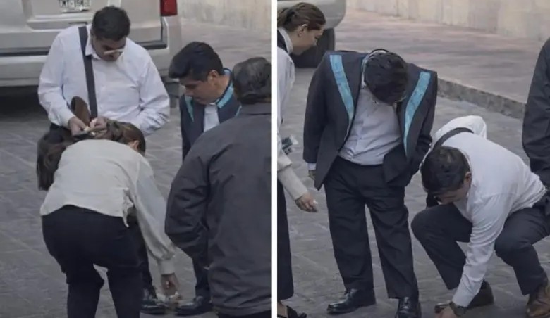 Previo a la ceremonia en el Teatro de la República, una mujer en tacones se agacha para limpiar las puntas de los zapatos del ministro en medio de la calle.