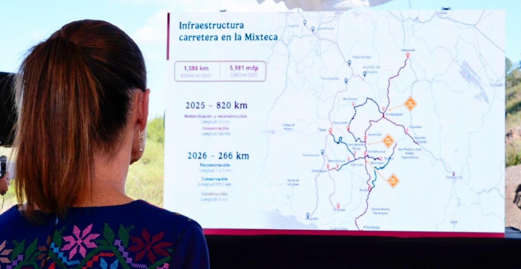 San Pablo Teposcolula, Oaxaca, 22 de noviembre (entresemana.mx). Desde el corazón de La Mixteca oaxaqueña, la Presidenta Claudia Sheinbaum Pardo presentó los avances del Plan General Lázaro Cárdenas del Río, una estrategia integral y de articulación entre dependencias y los tres niveles de gobierno en beneficio de 1.54 millones de habitantes y que suma una inversión de 5 mil 900 millones de pesos (mdp) en infraestructura carretera, estructura hospitalaria, Programas para el Bienestar y caminos artesanales.
