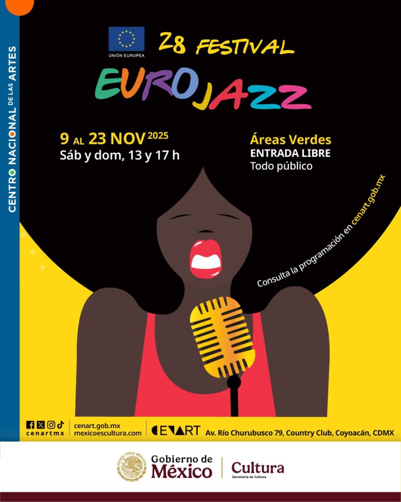 El Festival Eurojazz 2025 vuelve a encender las Áreas Verdes del Centro Nacional de las Artes del 9 al 23 de noviembre, envuelto en un ambiente familiar de picnic y sol otoñal, con un cartel que integra: el domingo 9 a Córas Trio (Irlanda) y Yvonne Moriel :: Sweetlife (Austria); el sábado 15, Pekka Pylkkänen Quartet (Finlandia) y Texas Tech Jazz Orchestra (EE.UU.); el domingo 16, No Square Jazz Quartet (Suiza) y Gilipojazz (España); el sábado 22, el grupo nacional 5° Elemento junto al Leonardo Prieto Ensemble (Países Bajos); y el domingo 23 cierran Luca Velotti 4TET (Italia) y Marcin Masecki Trio (Polonia). Conoce el line up en https://www.cenart.gob.mx/festival-eurojazz-2025/